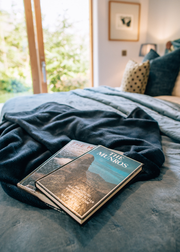 Large French windows open directly onto the outdoor decking area, perfect for al fresco breakfasts, soaking up the sunshine, or nightcaps under a star-filled Highland sky. Furnished to a high standard with a mix of antique pieces, family heirlooms and original artwork by local artists – gorgeously grown up and an oasis of calm where you can relax, snuggle up, starfish on the huge super-king bed or just put your feet up and escape with a good book after a day in the fresh highland air.